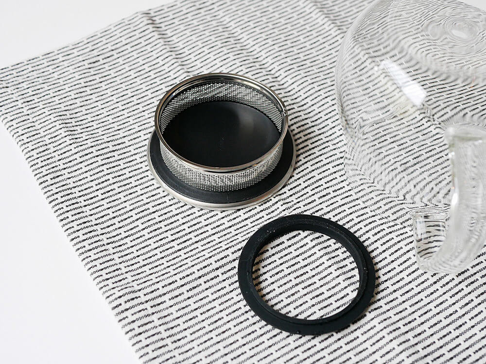 ストレーナーは細かい茶葉が濾せて、フタはお茶を注ぐ時に傾けても落ちにくい構造。フィルターのフチにはシリコーンゴムパッキンも付いていて、液だれもしにくい親切設計です。