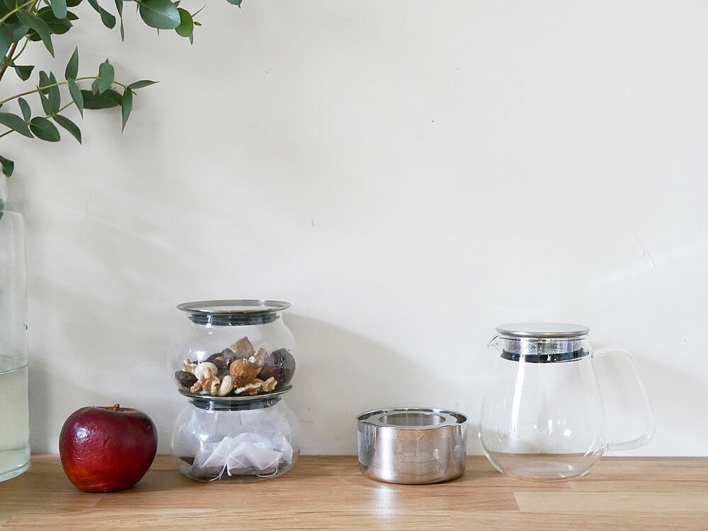 シンプルなティーポットはお茶の時はもちろん、食卓でフレーバーウォーターの入れ物として使うのも◎。
