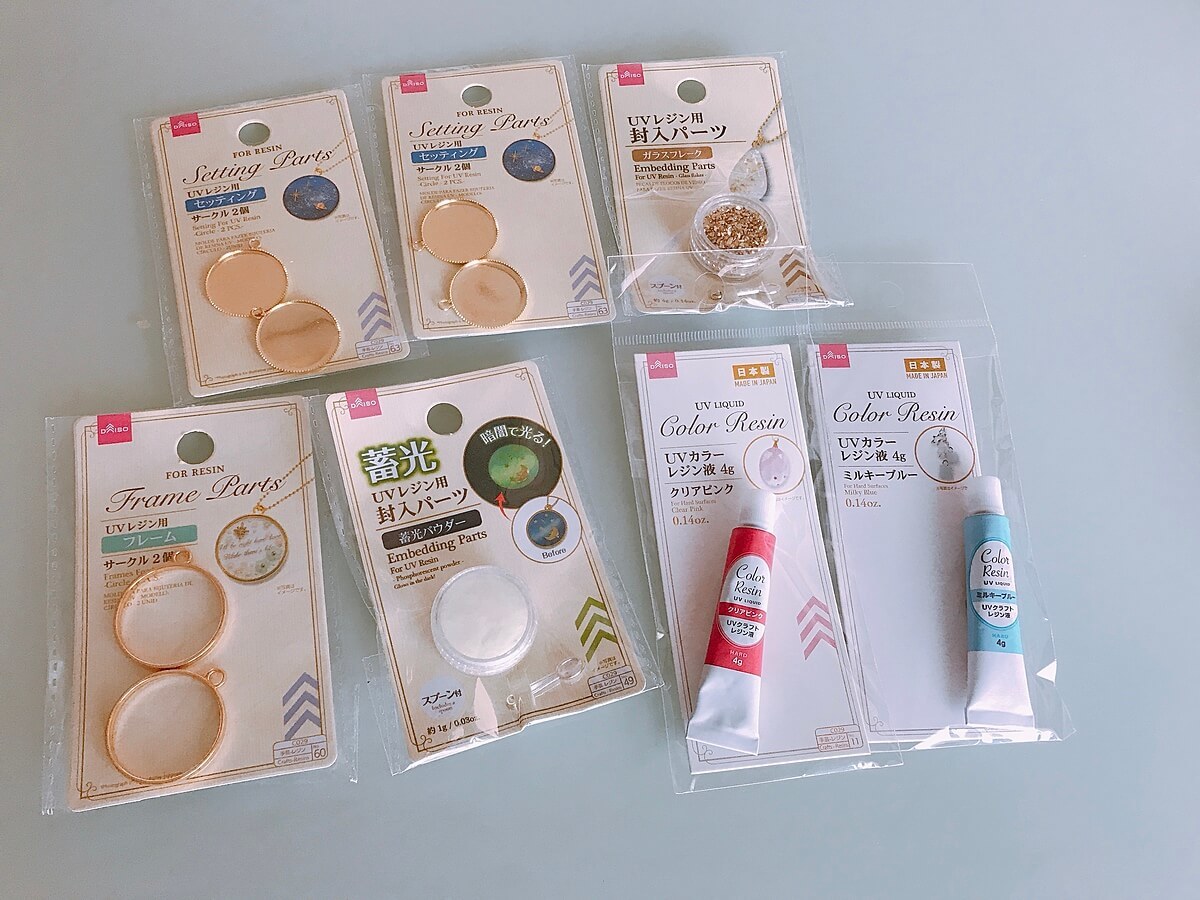 今回買ったレジンクラフトグッズはこちら。 レジン液2種類、ベース2種類、封入パーツ2種類。レジンは硬化機が必要ないように日光でも固まる仕様になっています。早速作ってみました。