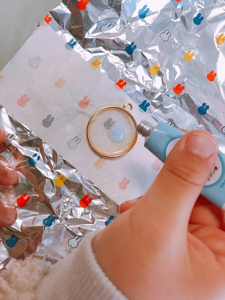 ダイソーにはレジン専用のシリコンシートなども売られていますが、クッキングシート又はアルミホイルなどにマスキングテープを貼って代用できます。レジン液を流し込み封入するパーツを入れていきます。