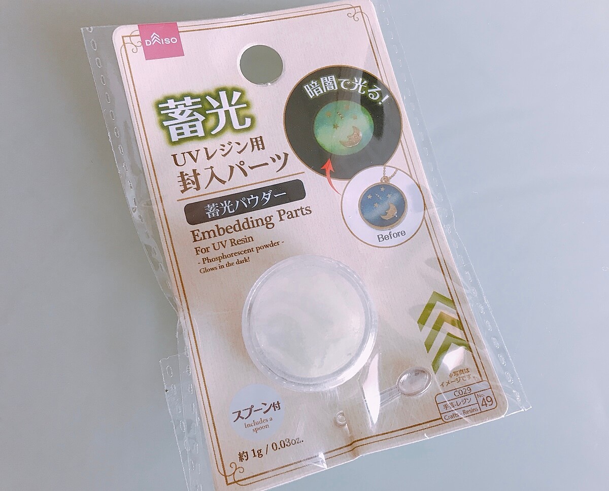 こちらの蛍光パーツは粉タイプなので付属のスプーンを使ってレジン液に混ぜ込んでいきます。 ある程度の量になったら好きなものを乗せて一度日光に当てて、硬化させます。