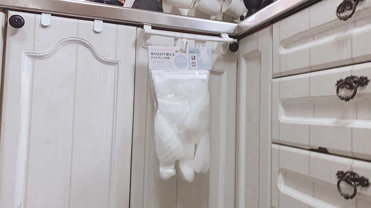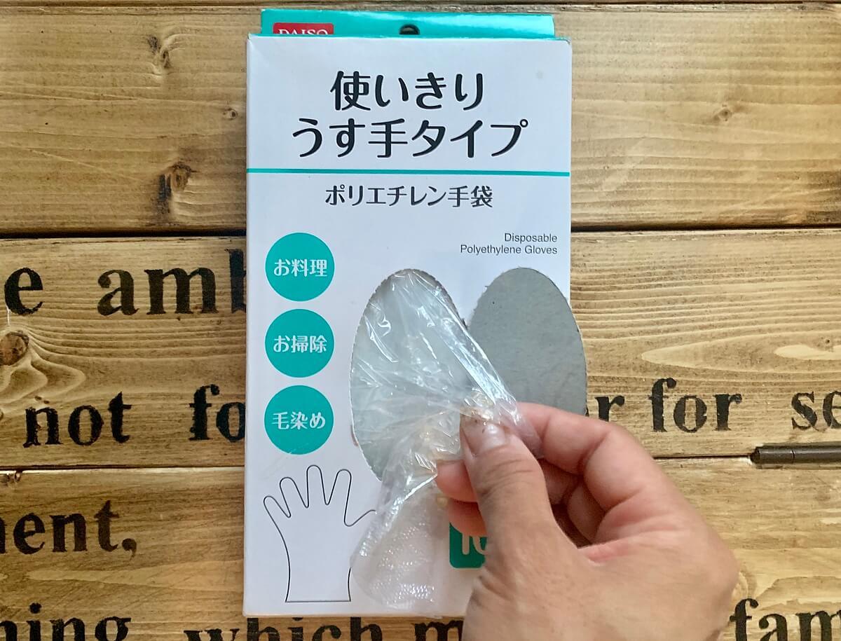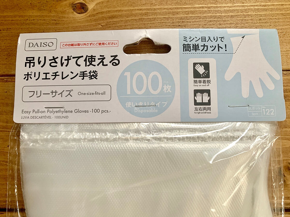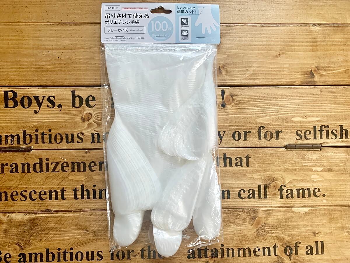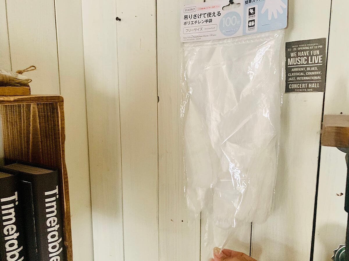 こちらはダイソーで発見した吊り下げて使えるポリエチレン手袋です。