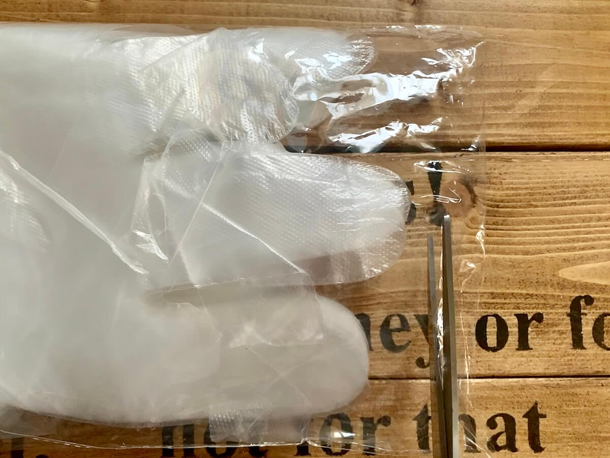 使用する際、まずは手袋が入っている袋の端をカットします。
