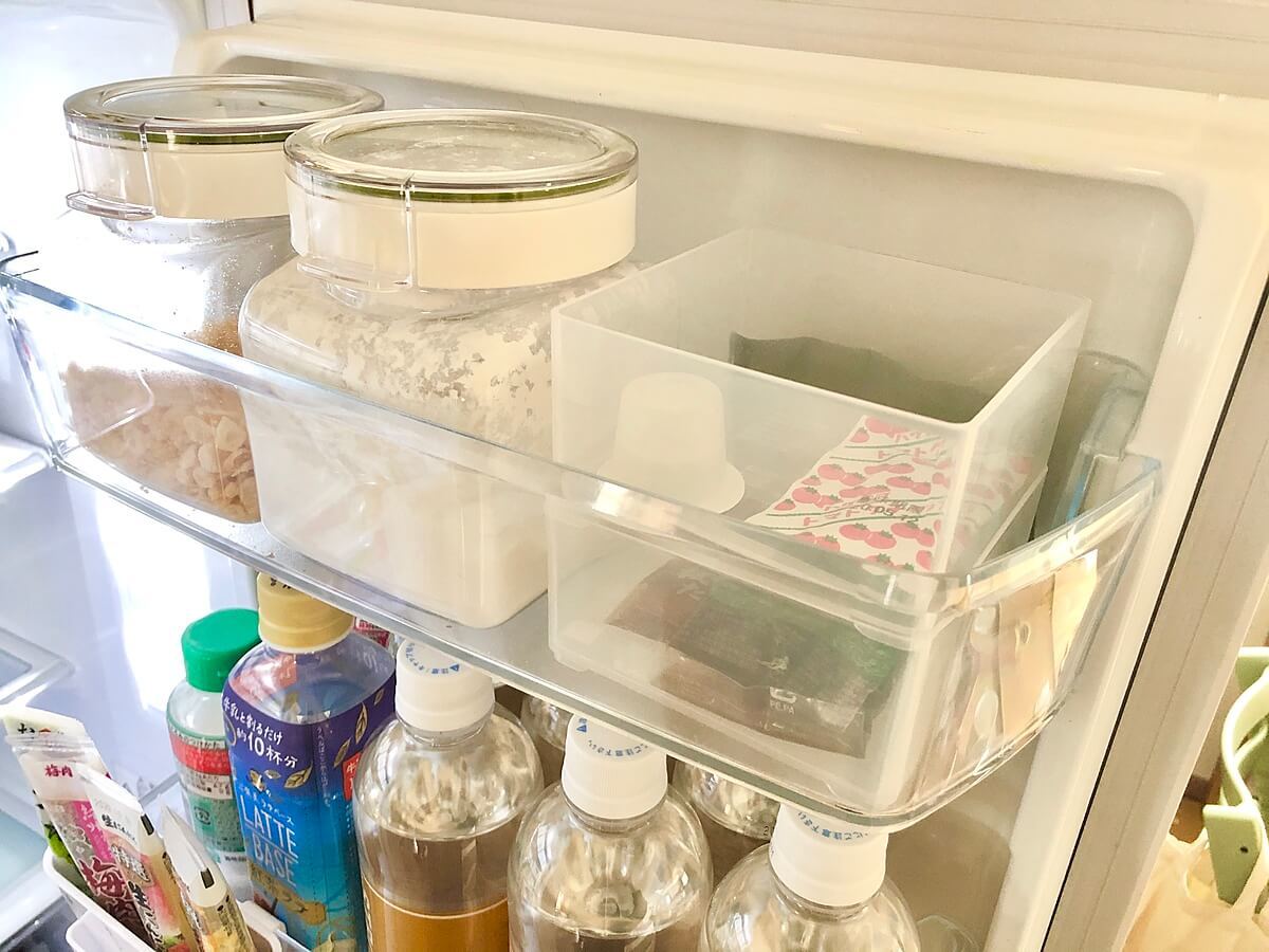 使わなかった個包装のケチャップやドレッシングなどを、セリアの引き出し整理ボックス2段を使用してドアポケットに入れています。