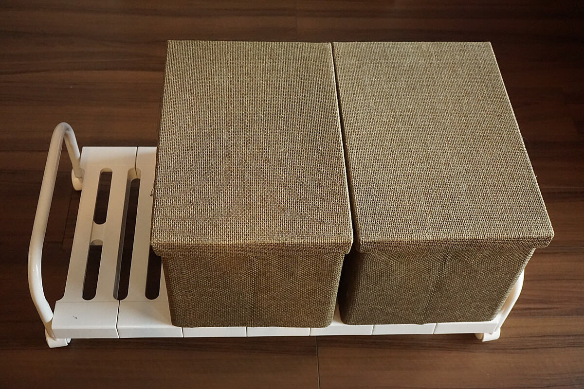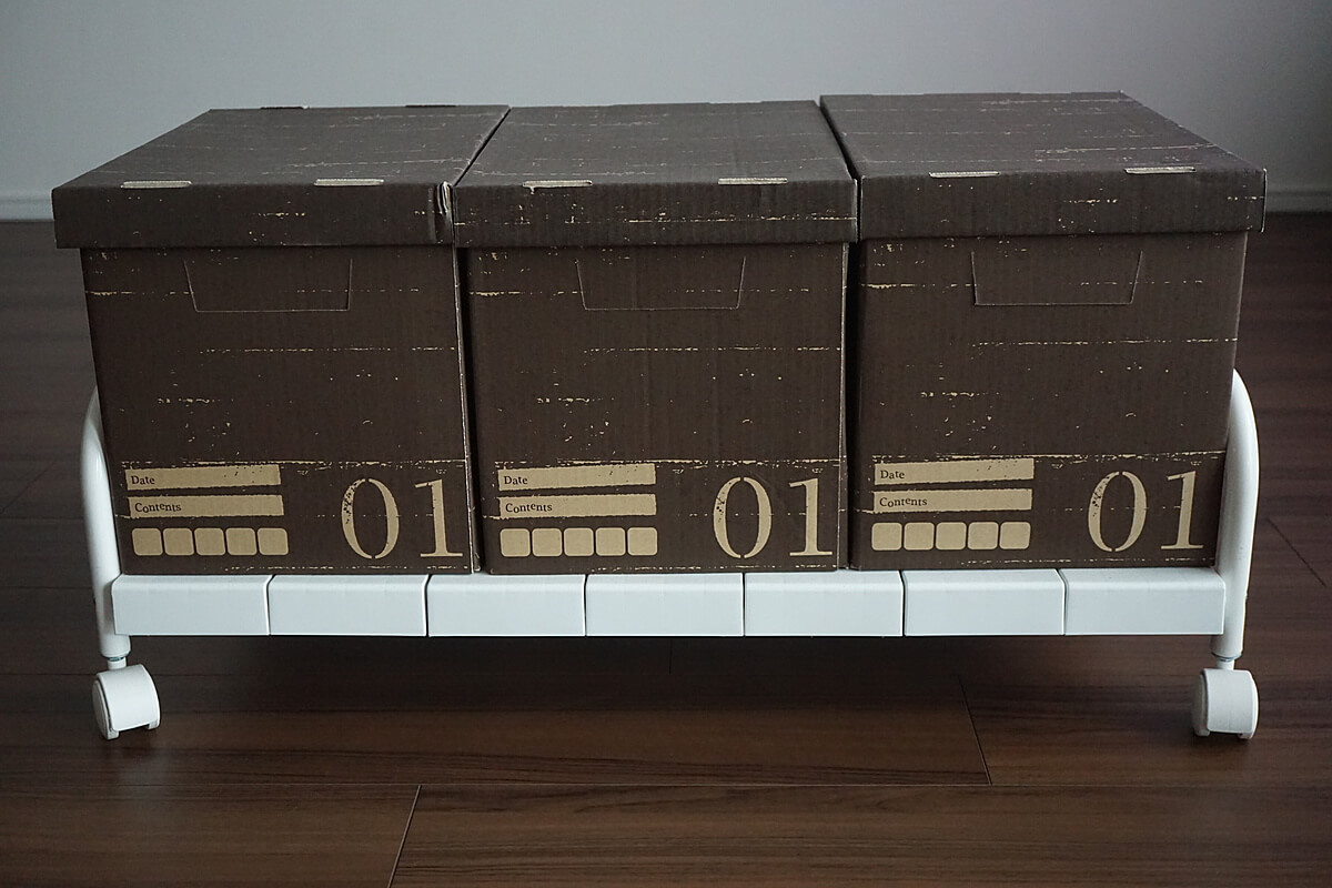 ボックスを1列に並べ、その上にはよく使うものを置くという収納方法や……。