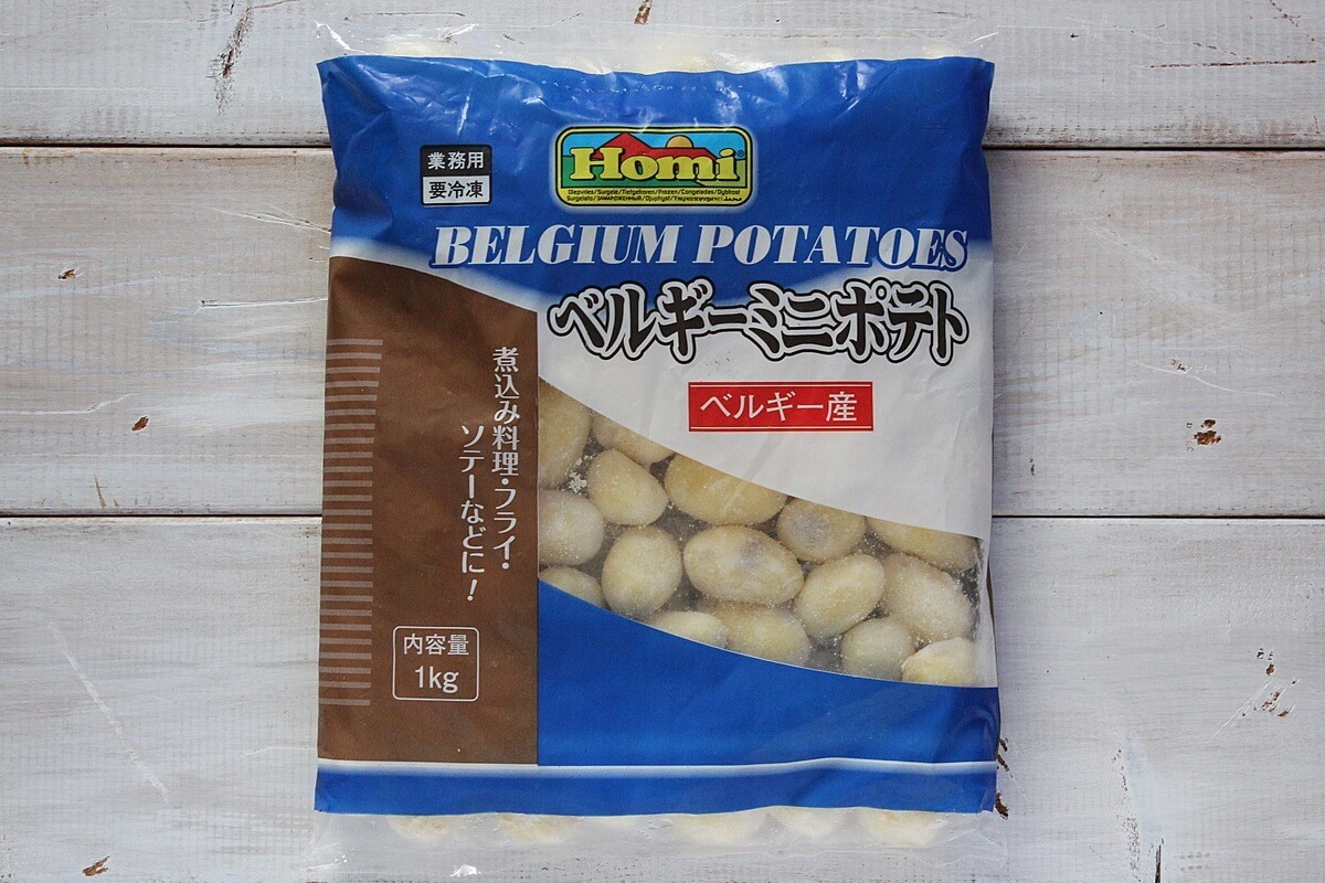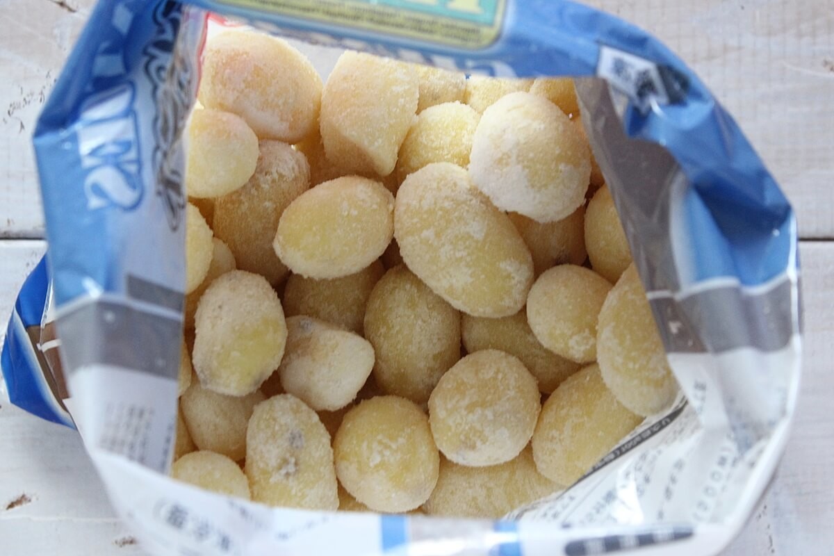 こちらの商品は、軽くゆでて、丸くカットされた、冷凍状態のミニサイズのジャガイモです。