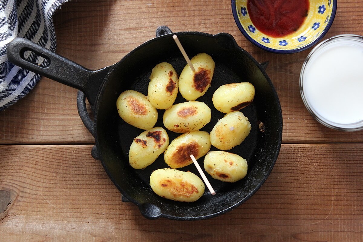 (2)フライパンにオリーブオイルを大さじ2ほど入れ、ころころ転がしながら表面がパリッとするまで焼き、塩こしょうで味を調えたら出来上がり!