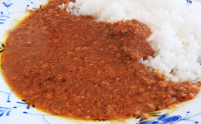 鶏のひき肉は惜しみなく入っています。原材料を確認すると、玉ねぎとトマトが入っているはずですが、形が残っているものは鶏のひき肉だけでしたね。子どもには辛すぎたようで、4歳の子どもは一口つけて「もういい」と言ってました……。