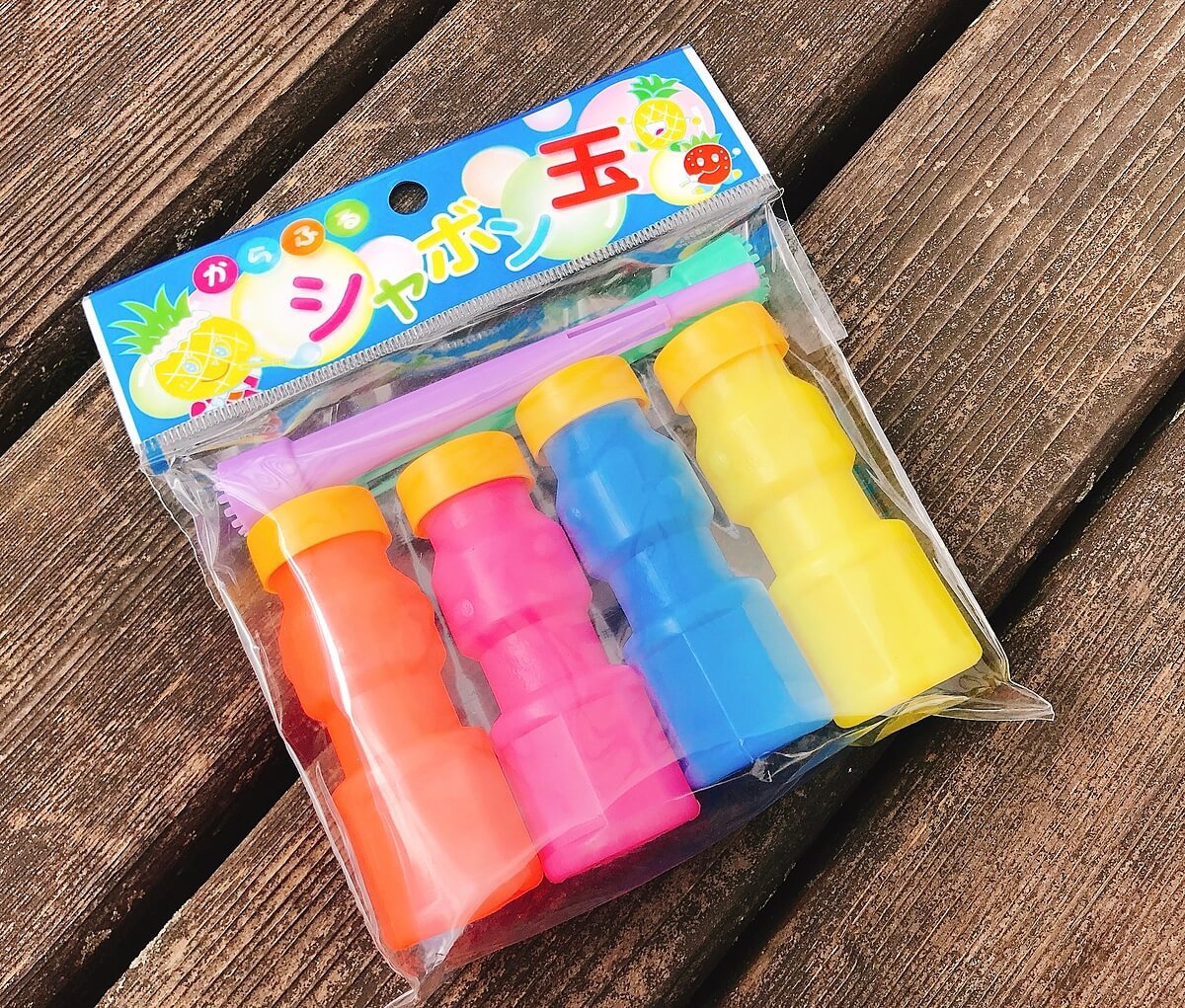 こちらはストロー2本とシャボン液4本がセットになったよくあるタイプのシャボン玉です。