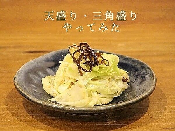 試しに、2分程で作ったキャベツ塩昆布和えを上記のルールで盛り方を気をつけたものと、無の状態でドサッと盛ったものを比較しました。
