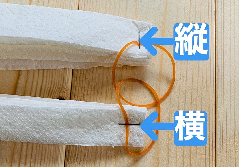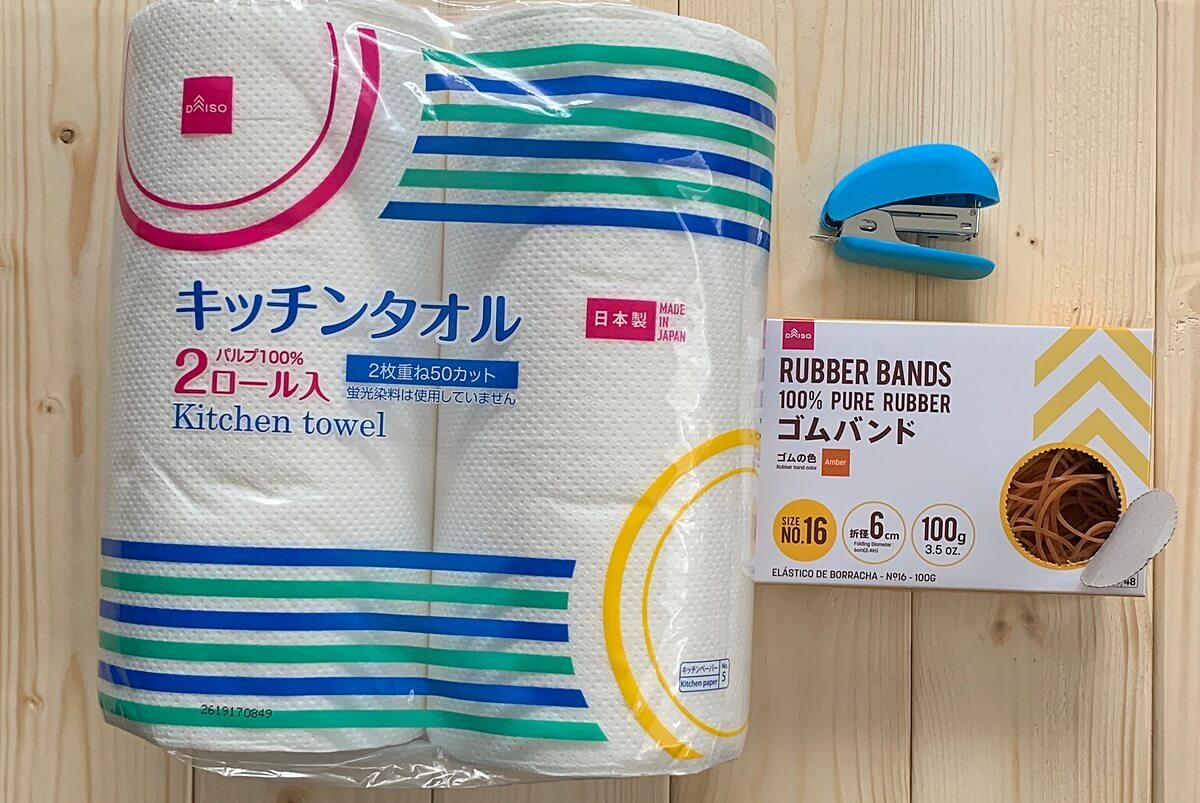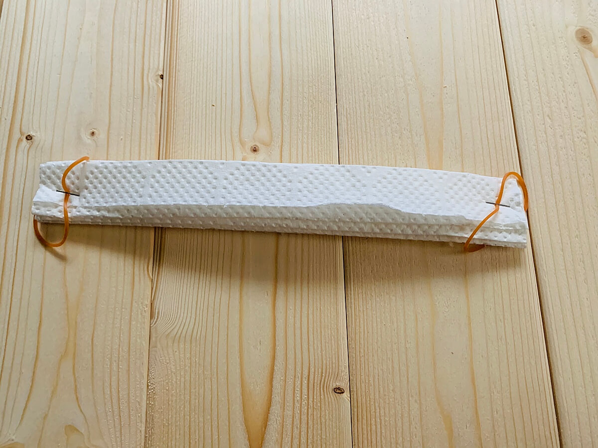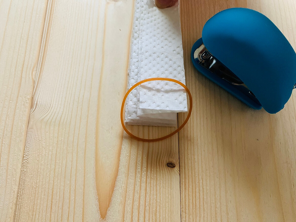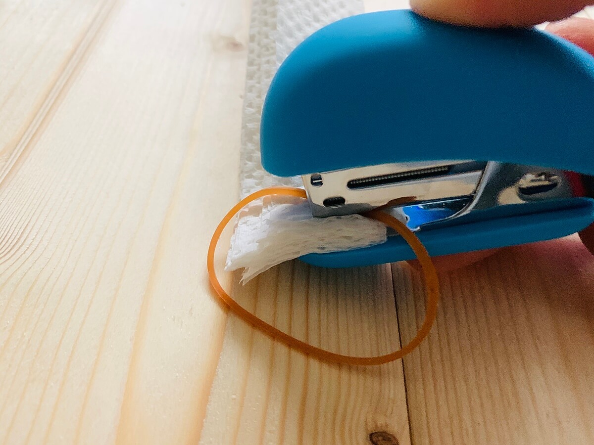 蛇腹に折ったキッチンペーパーの端に輪ゴムを置き、ホッチキスで留めます。