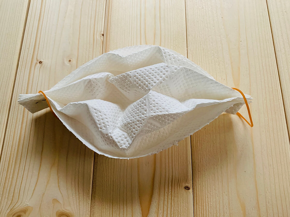 ここでは、警視庁災害対策課ベストツイート集の中から「キッチンペーパーで簡易マスク」を実際に作ってみました。