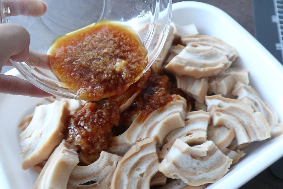 ニンニク、生姜、Aを合わせた調味料を、車麩にかけて味がまんべんなくなじむように軽くもみこみます。