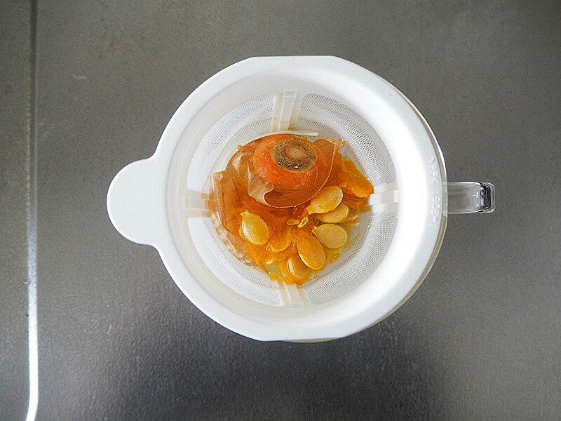 この日はかぼちゃの種とワタ、人参の皮とヘタ、玉ねぎの皮、小松菜の芯と水500ml、酒少々をだしポットに入れて電子レンジで9分程チン。