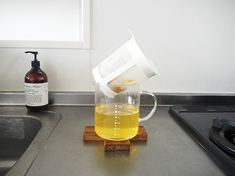 電子レンジで8分加熱し、冷めたらストレーナーを外してこします。