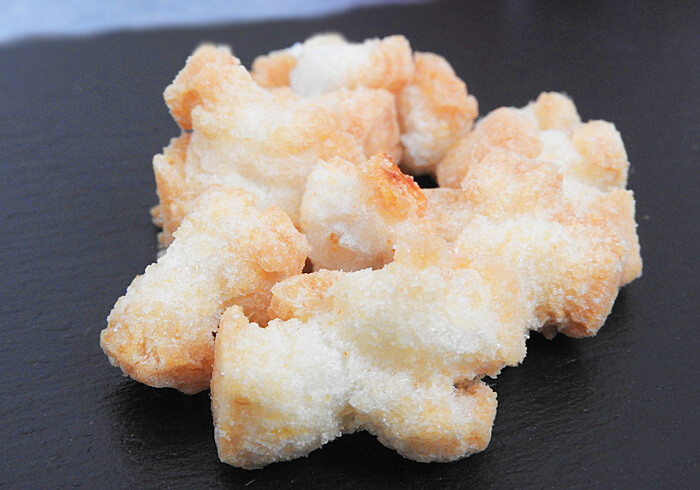焼き塩で味付けされています。小袋の中には、一口で食べられるサイズの揚げ餅がたくさん入っていますよ。