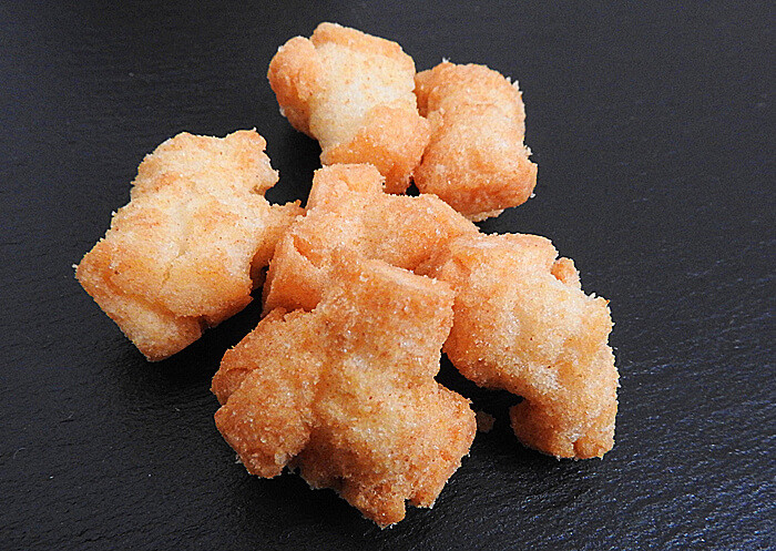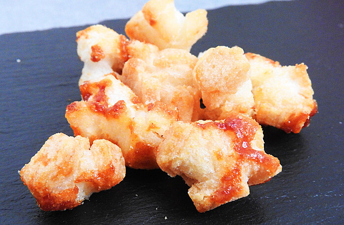 写真では判別付きにくいと思いますが、揚げ餅によってはあまり一味唐辛子と明太子の調味液がかかっていないものも……。なので、味にはムラがありましたね。製造の工程上しかたがないのかもしれませんが、できれば味を統一して欲しいと感じました。