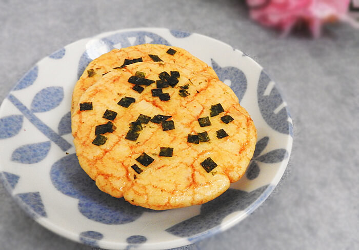 見た目は硬そうなしょうゆせんべい。口の中に入れてみると、意外とソフトな食感。かつお節のだしと海苔の優しい味わいは最高です。醤油の味はくどくなく、少々甘めに仕上がっていました。全体的に口あたりは軽やかですよ。お茶と一緒にいただくのが◎。