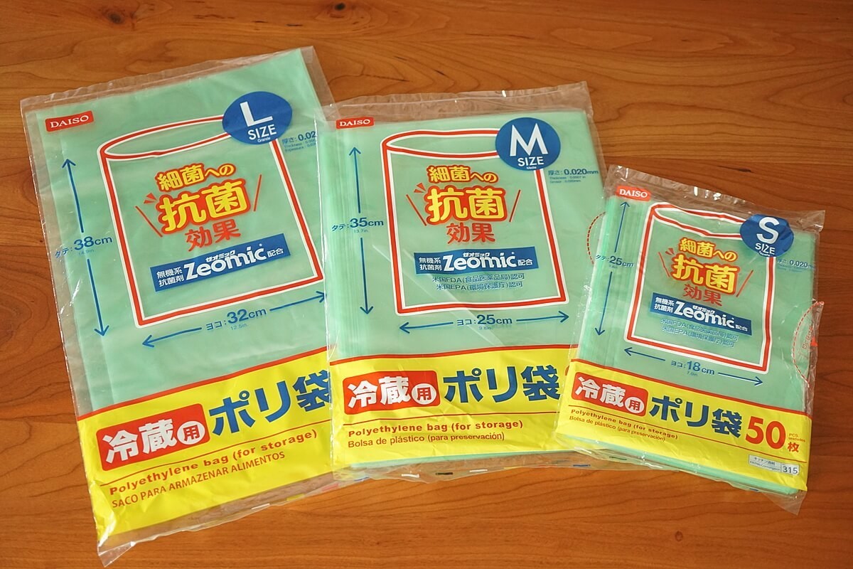 なにか良いものはないかと思っていたところ、ダイソーで、「抗菌効果がある冷蔵用ポリ袋」を発見したので試しに使ってみました。