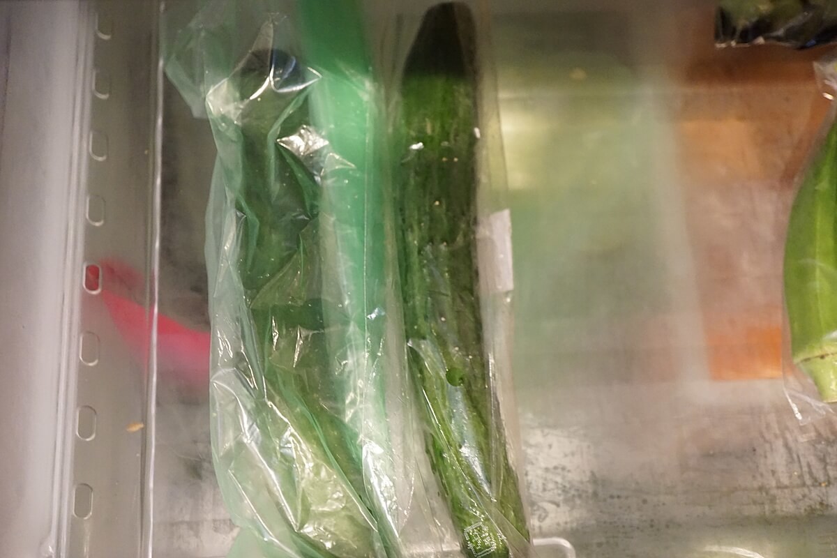 スーパー袋で保存したきゅうりは水分がぬけてしまい、一回り小さくなっています。