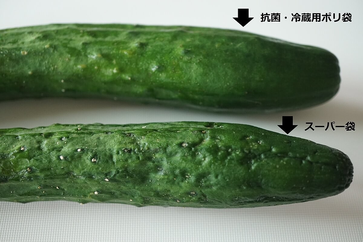 スーパー袋で保存したきゅうりは水分が飛んでしまい、表面がしわしわになっていますが、冷蔵用ポリ袋で保存したきゅうりは表面に変化はみられませんでした。