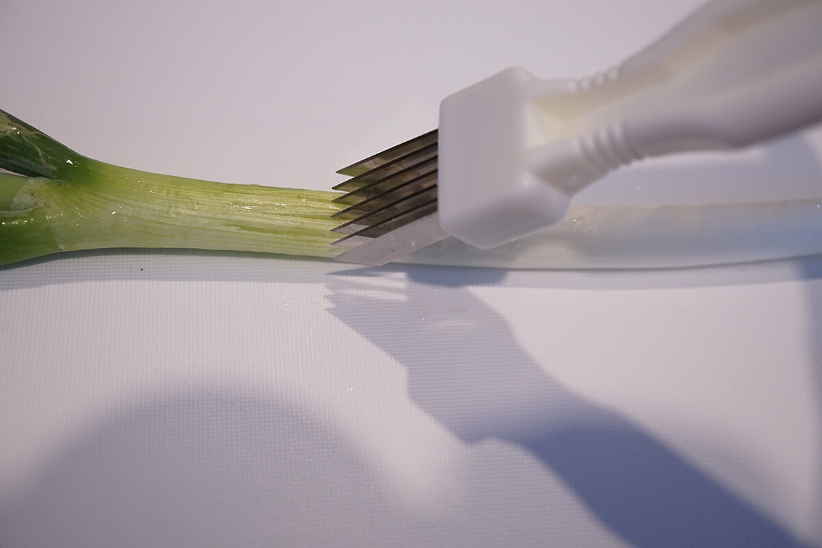 白髪ねぎにネギカッターの刃を軽くあてて、さっと引きます。
