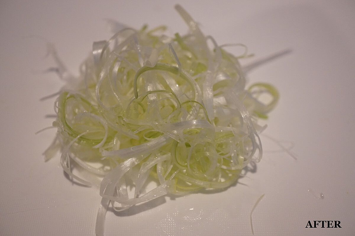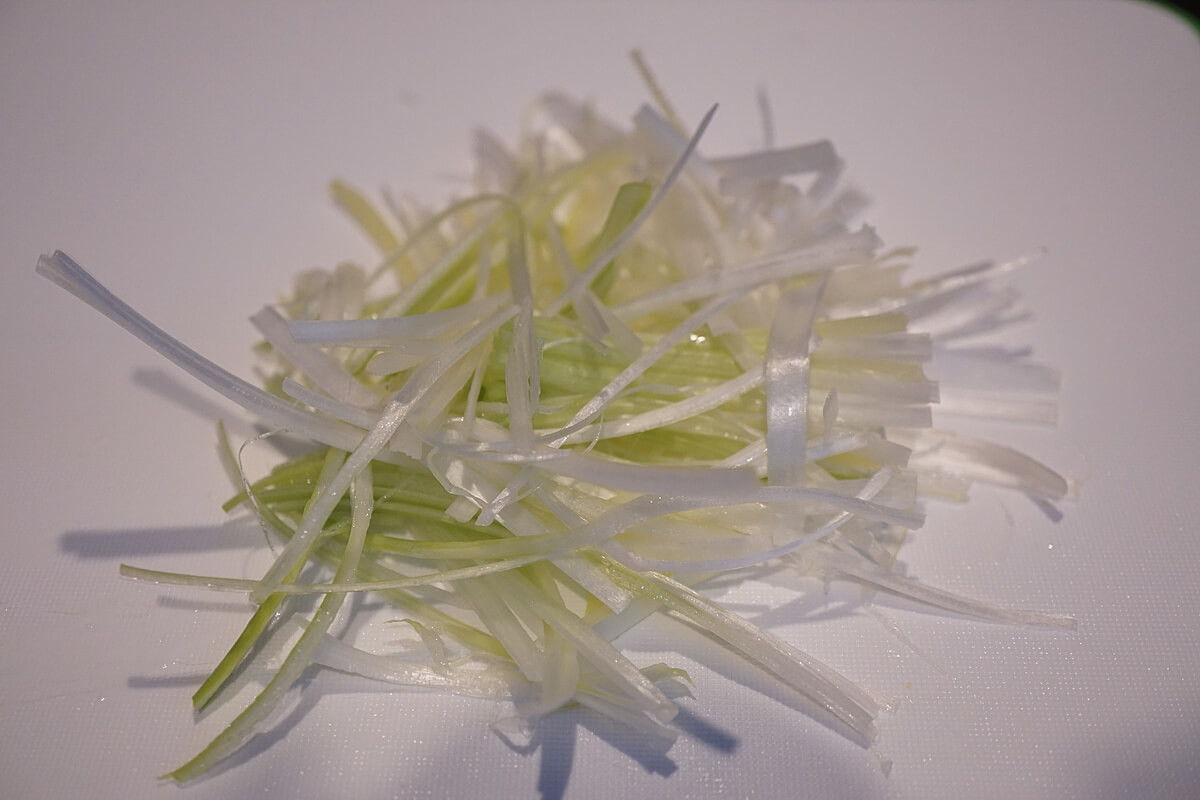 包丁でカットしたときと比べるとネギカッターの白髪ねぎは太いですが、 その太さだからこそのシャキシャキ感が味わえます。 ネギカッターを使えば、包丁で白髪ねぎを作る半分の時間でできるのでとても便利です。