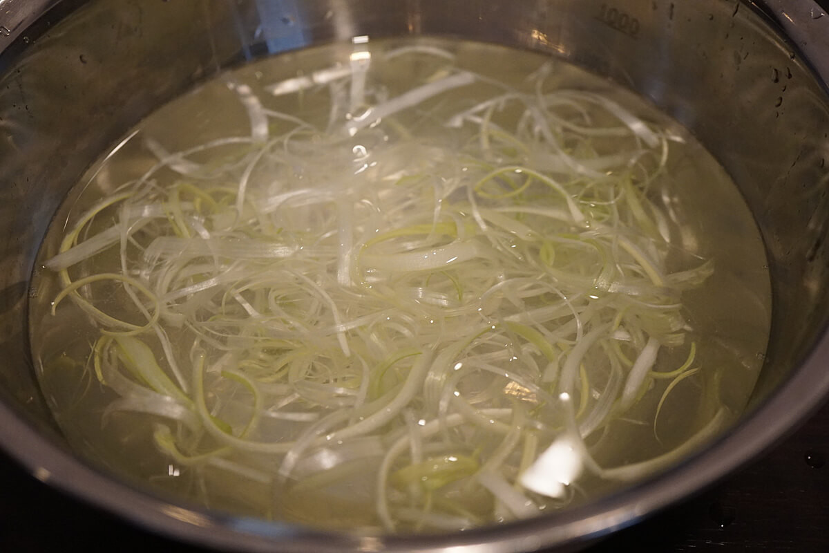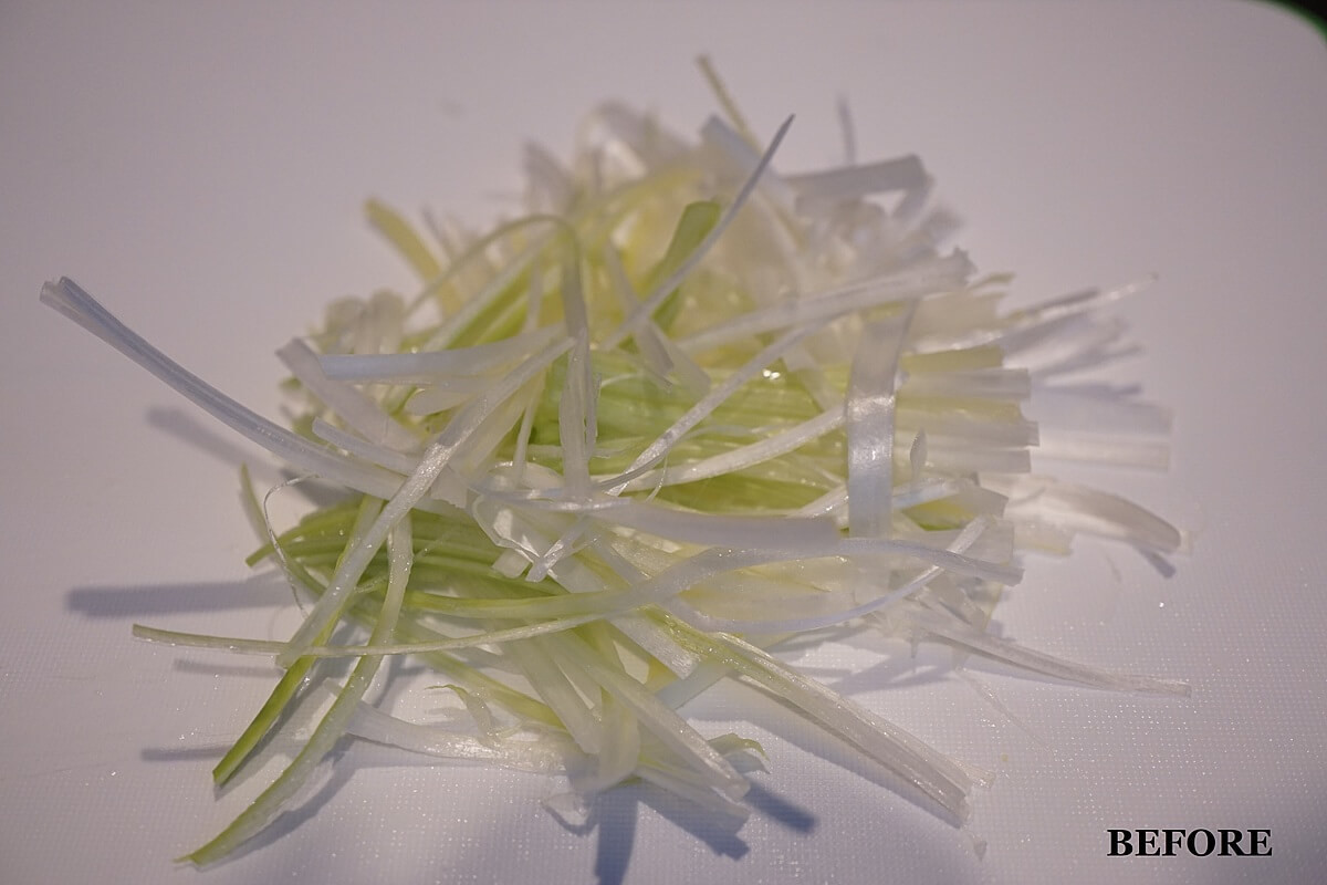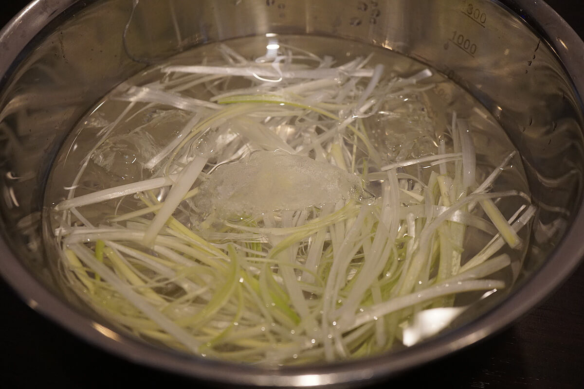 氷水にさらし軽くもむことで、ネギの辛さがぬけます。
