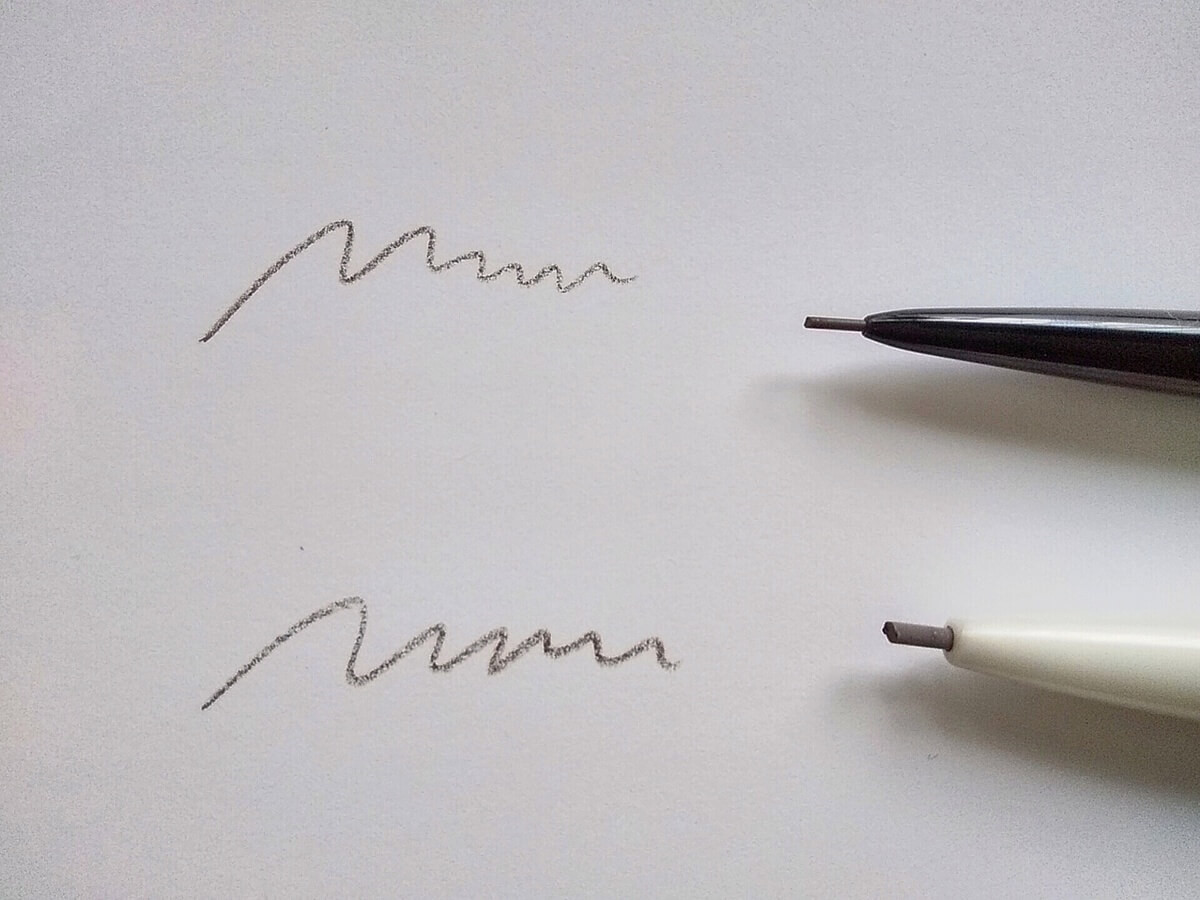 写真は、別ブランドの細芯タイプの商品(マジョリカマジョルカ ブローカスタマイズ スーパースリム)との比較画像です。上がセザンヌの超細芯、下がマジョリカマジョルカの細芯です。