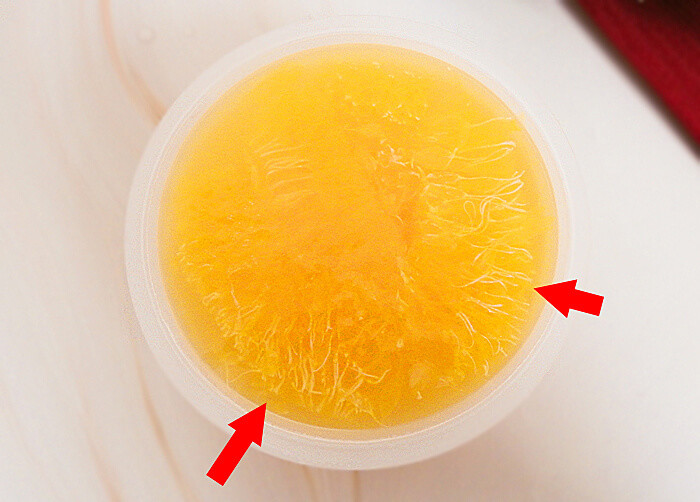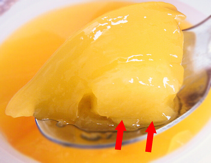 オレンジには大きな果肉が入っていましたので、当然白桃の果肉も入っていると思っていましたが……スプーンですくっても果肉が出てきません。
