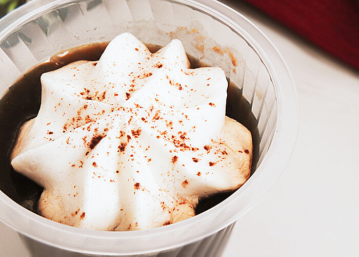 コロンビア産コーヒーを中心にブレンドして作った炭焼きコーヒーで仕上げたシャトレーゼの「炭焼き珈琲ゼリー~名水仕立て~」100円(税別)。上にはホイップクリームがトッピングされています。フルーツのジュレよりもサイズは小さめです。
