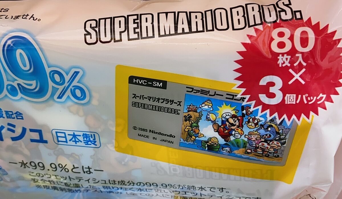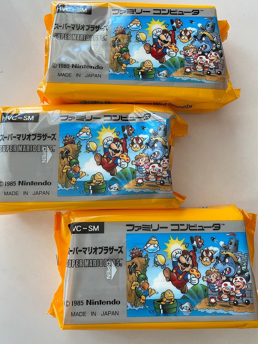 ファミコンスーパーマリオブラザーズパッケージのウエットティッシュです。 80枚入りが3つで、399円(税別)です。1つあたり133円は破格!