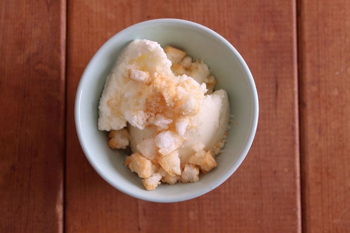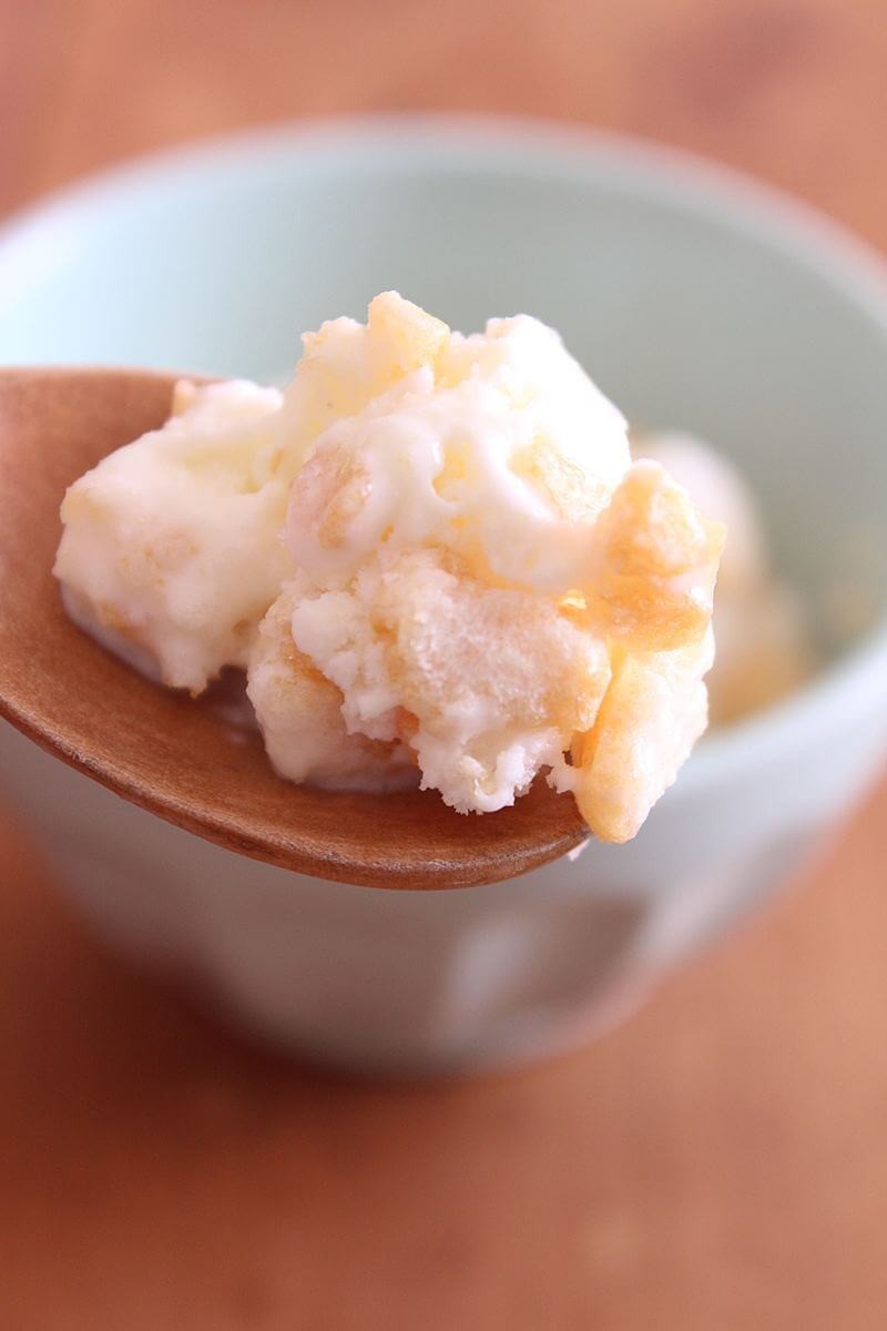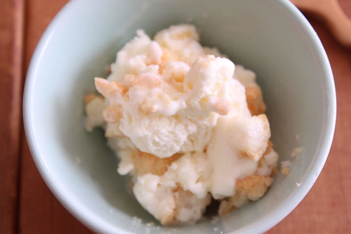 手で軽くくだいて、スプーンでアイスと混ぜながら
