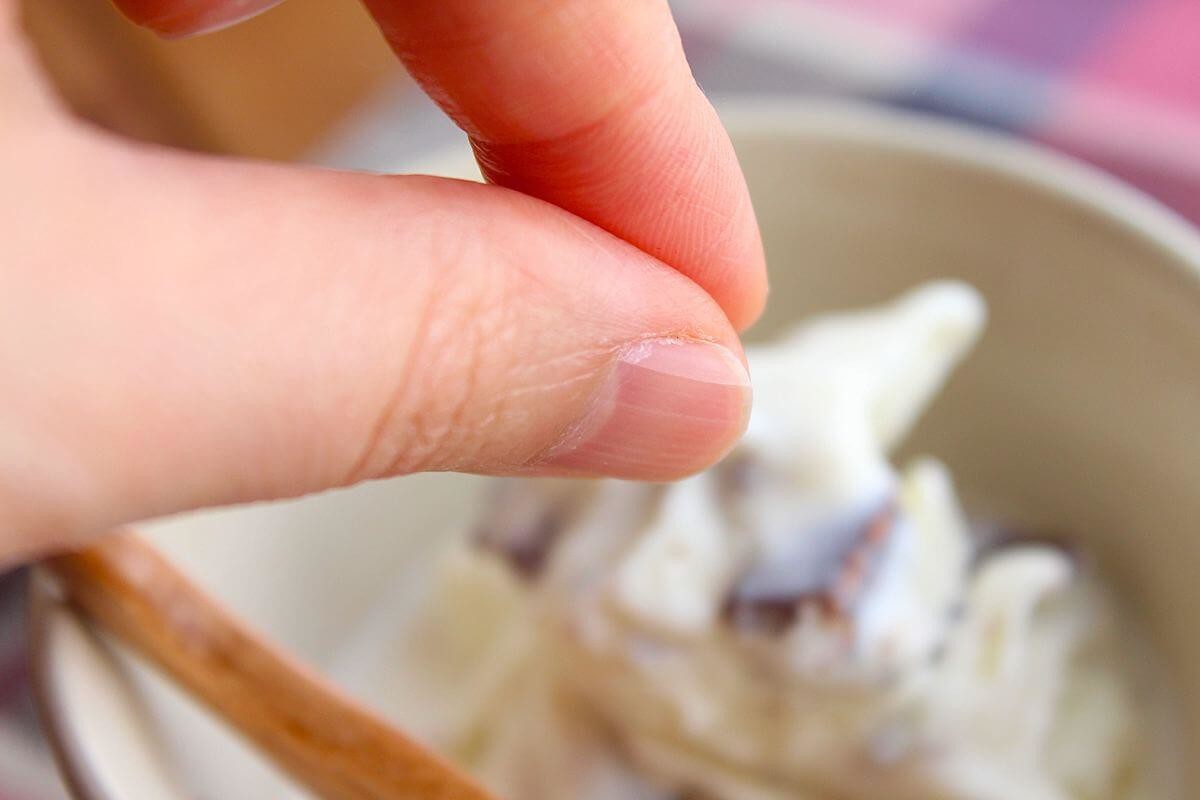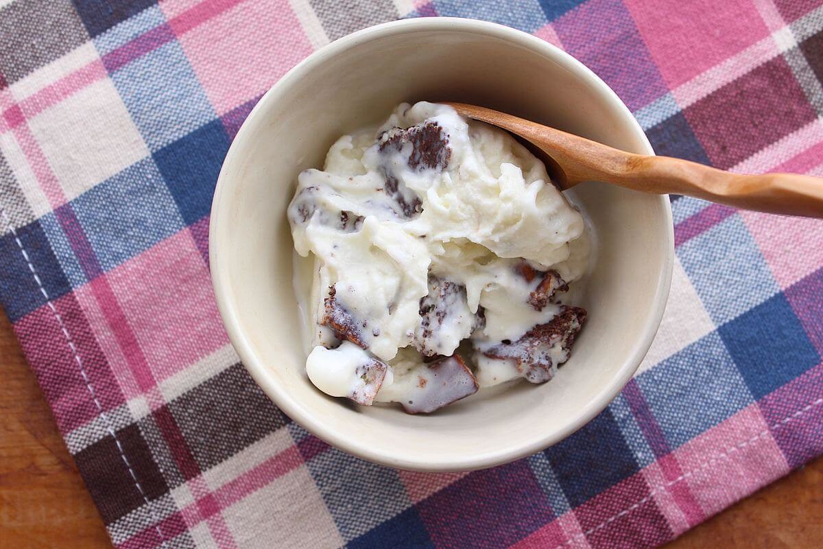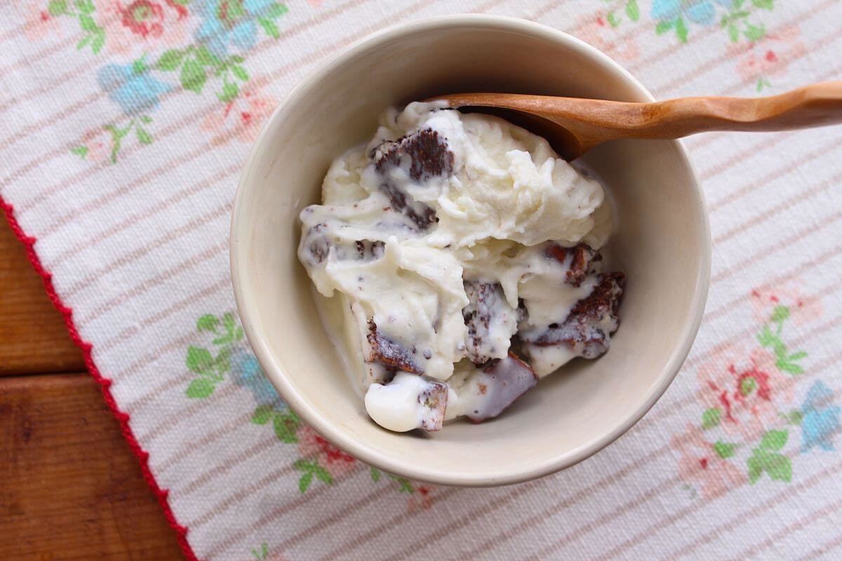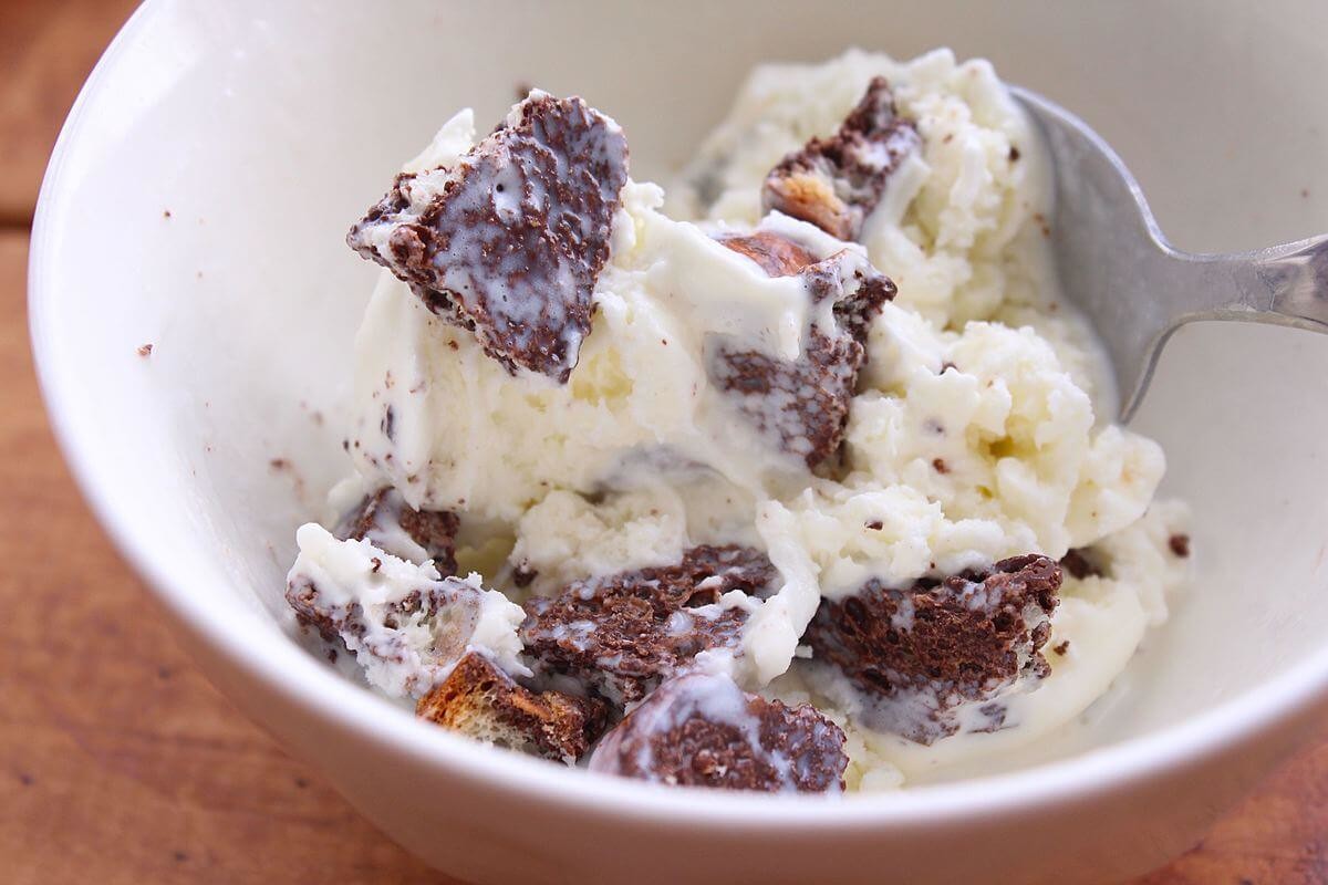 手で軽くくだいて、スプーンでアイスと混ぜながら