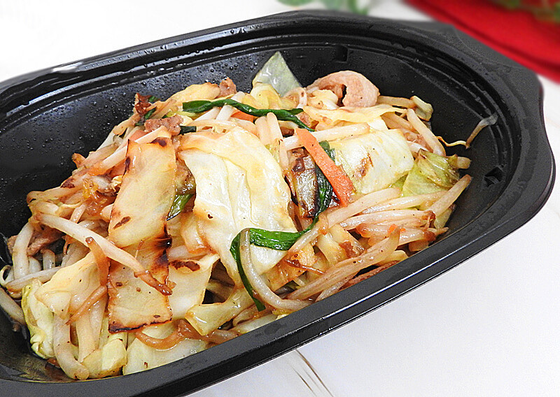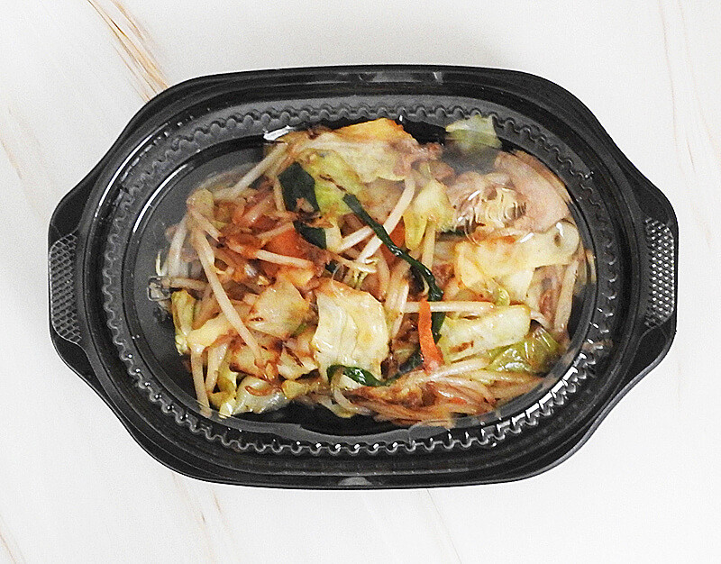 国産野菜が300gも入った日高屋の「野菜炒め」420円(税込)。手で持った時に重量感がありました。この量で420円(税込)なので、まあまあ安いかなという印象。