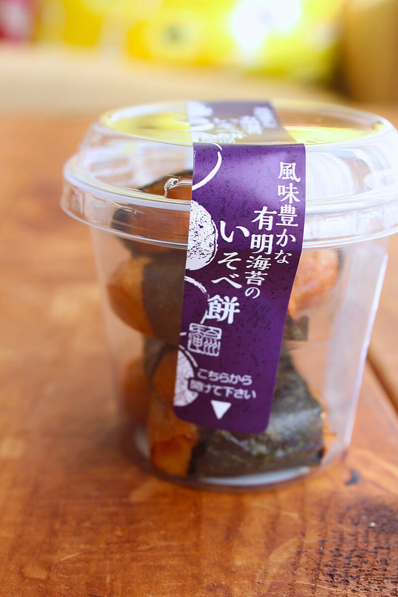 2種類のしょうゆを使った特製だれが、とにかくおいしい、有明産の焼きのりで巻いたいそべ餅です。