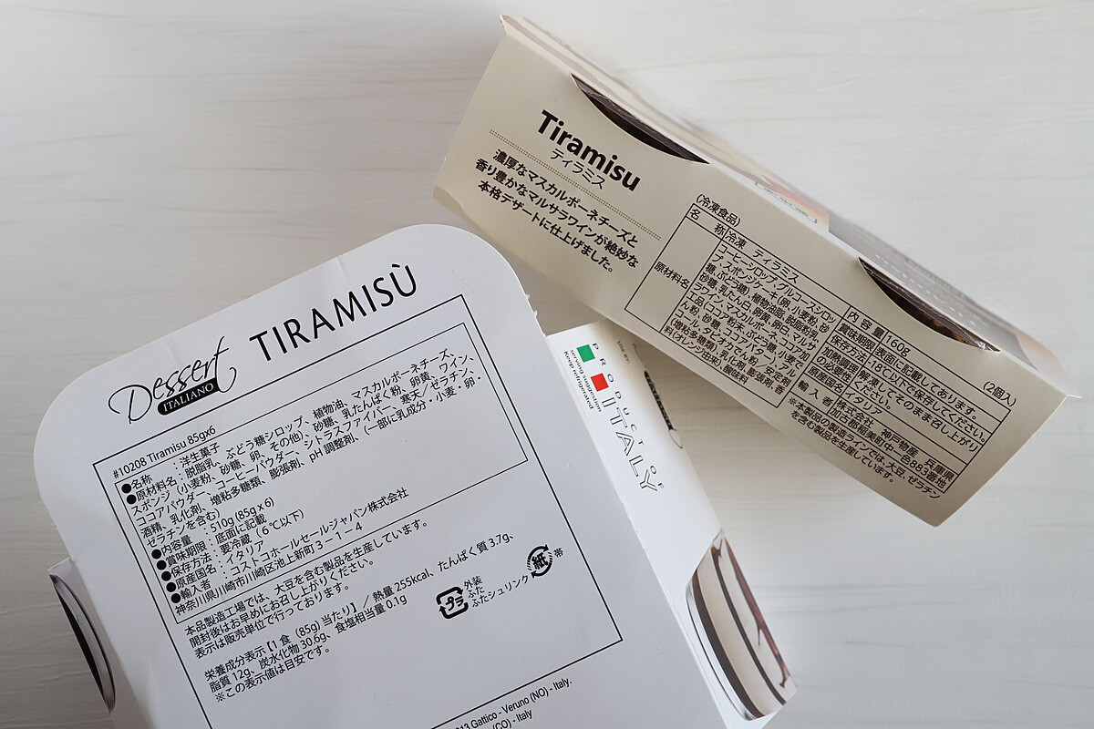 コストコのティラミスは85g、業務スーパーのティラミスは80g入りです。