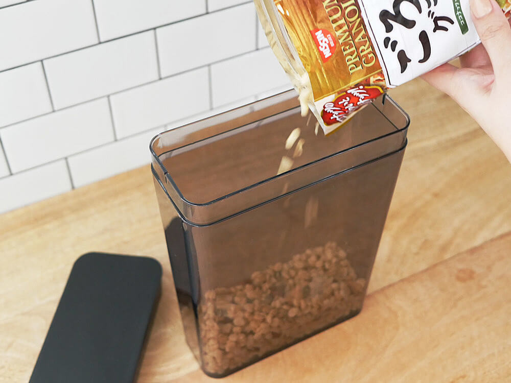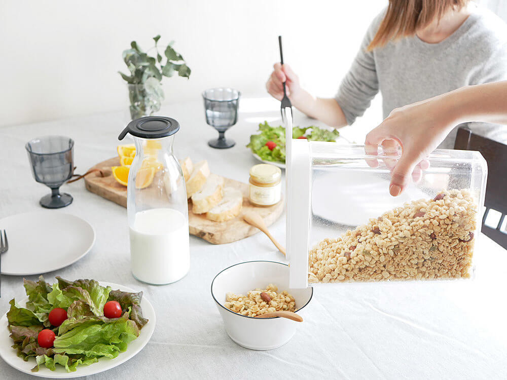 朝食用のシリアルや雑穀、ナッツ、クラッカー、お米や粉類、乾物の保存に便利な山崎実業「ドライフードストッカー」をご紹介します。