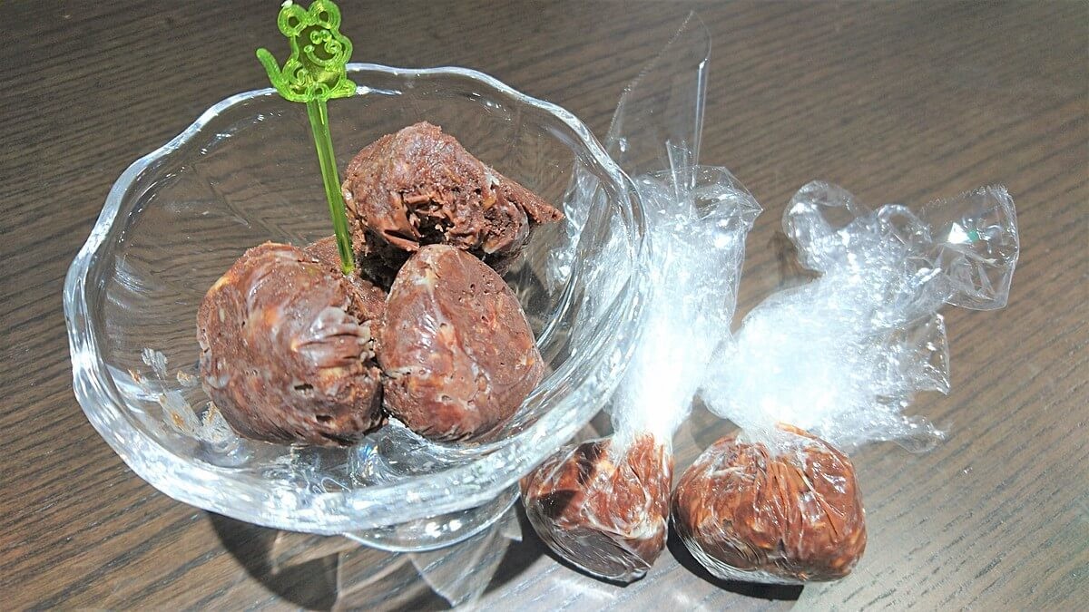 湯煎したチョコと、細かく砕いたフルーツクランチをまぜ、ラップで丸め、冷蔵室にいれて固めて完成。