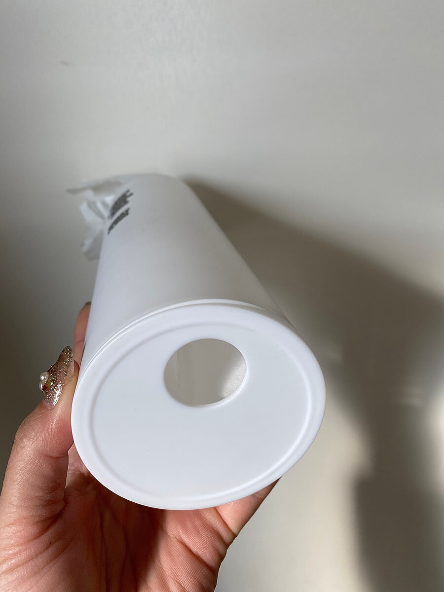 今まで、紙製の筒型ボトルはありましたが、今回はプラスチック製。中のティッシュは入っておらず、詰め替えボトルのみです。