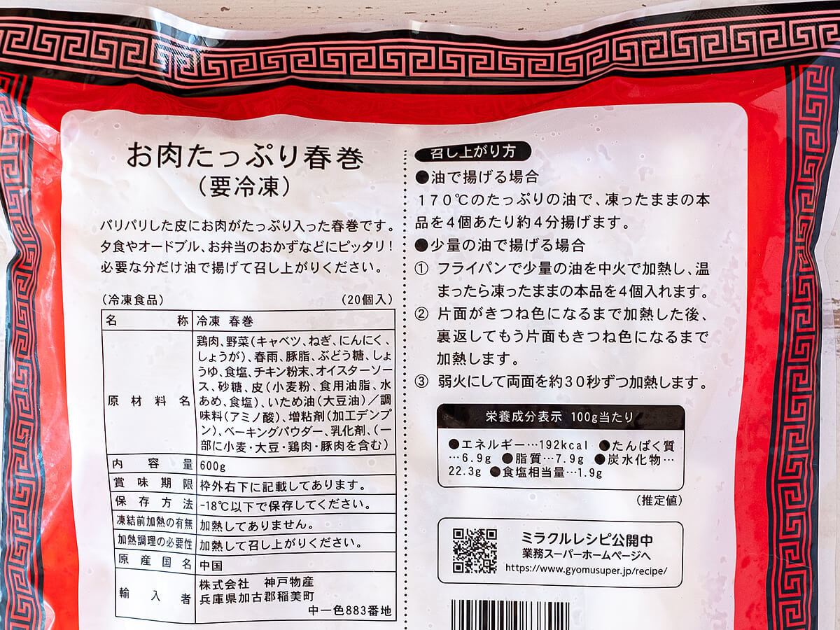 今回は、業務スーパーで購入できる「お肉たっぷり春巻き」をご紹介します。