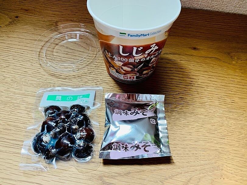 ふたを開けると、具材である真空パックにされたしじみと調味みそが入っています。