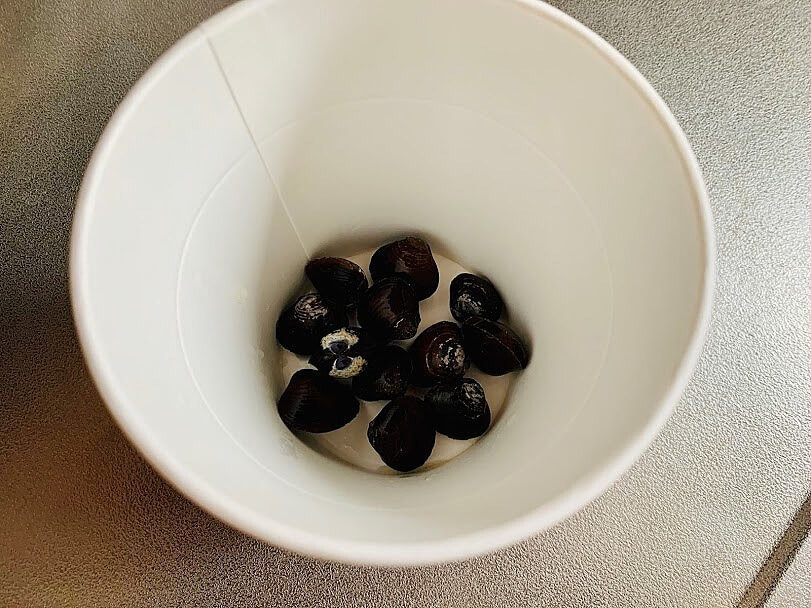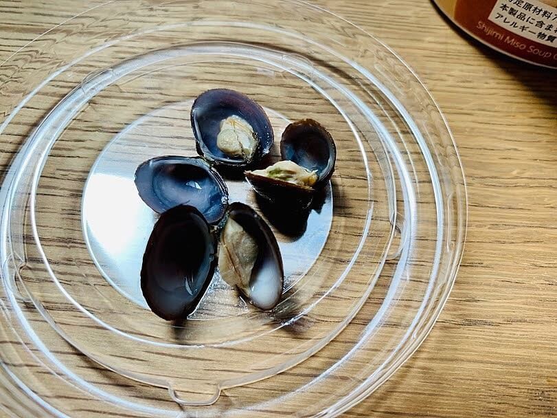 最初は閉じていたしじみが、お湯を入れることにより開きます!わくわく……。