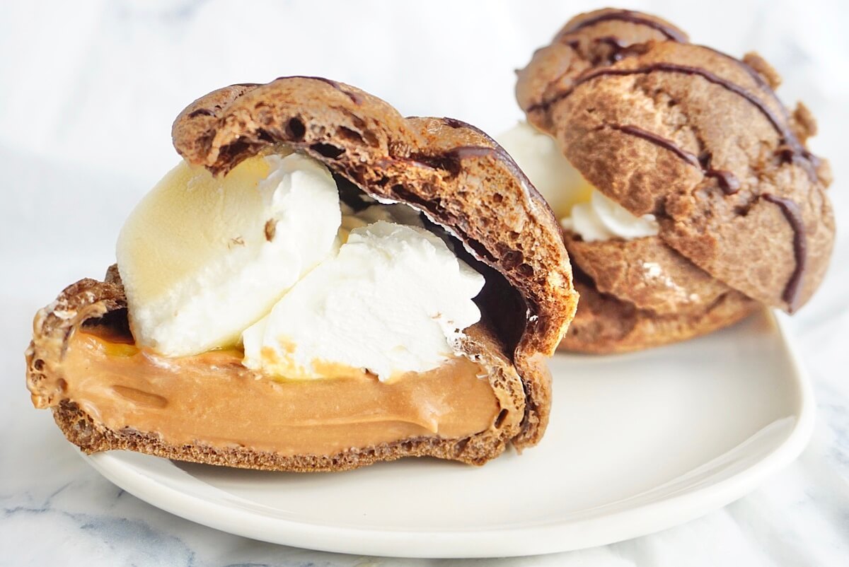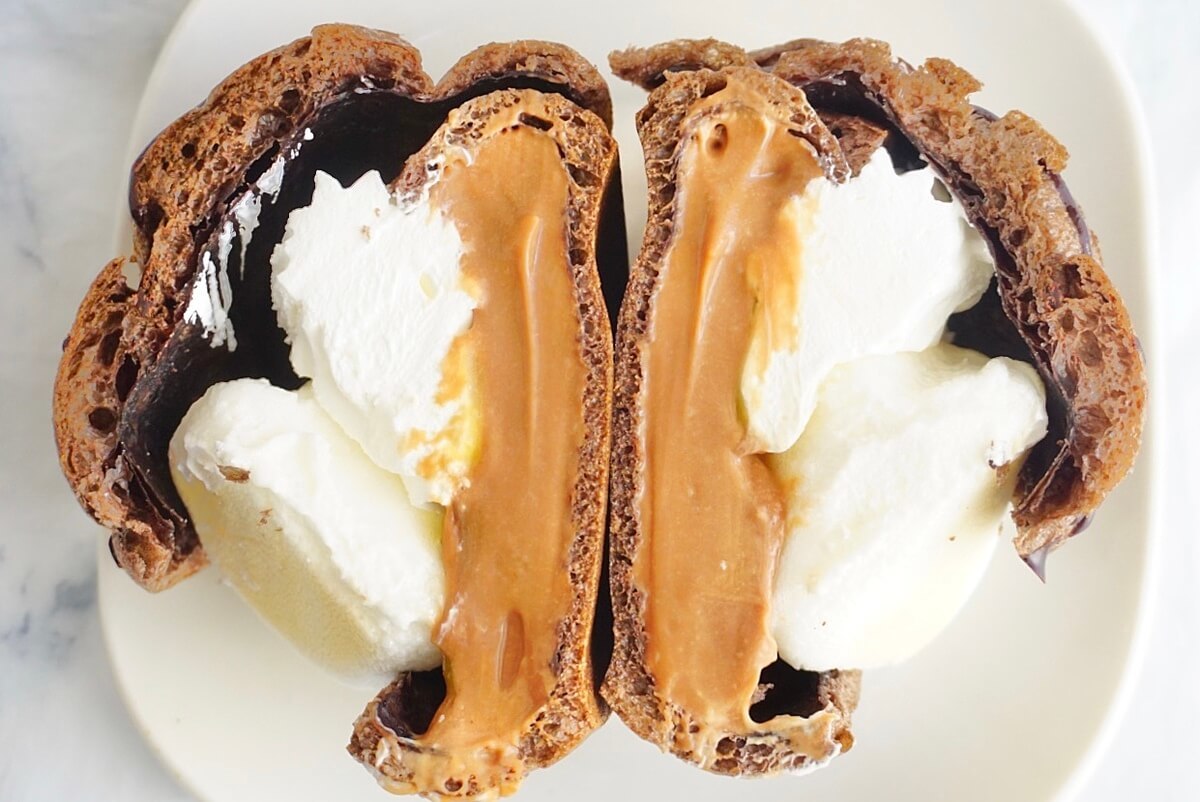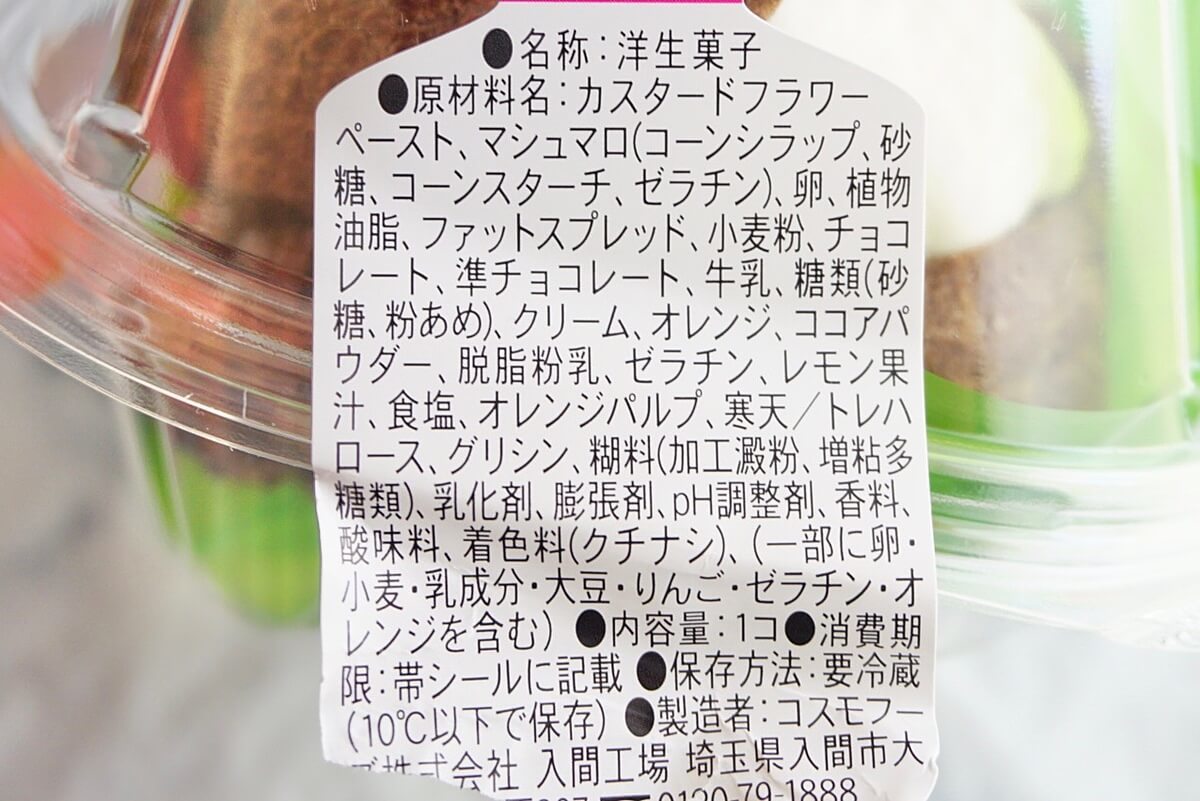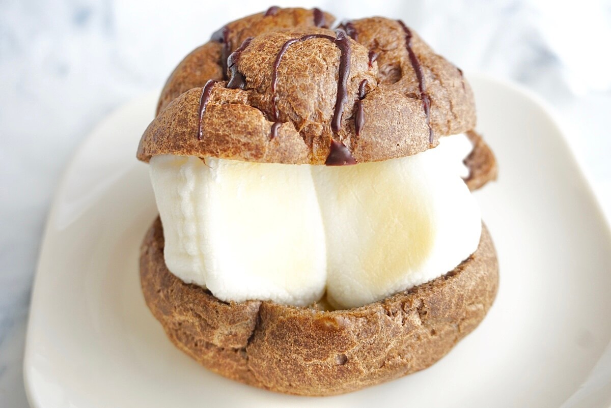 カットされたココアが練り込まれた生地に、チョコカスタードとオレンジソース、ホイップクリーム、焦げ目のついたマシュマロを挟んだシュークリームです。