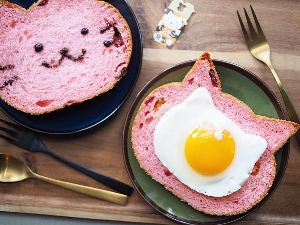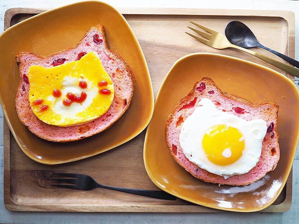こちらは話題のネコ型食パンに、ネコ型目玉焼きを作って組み合わせてみました♪