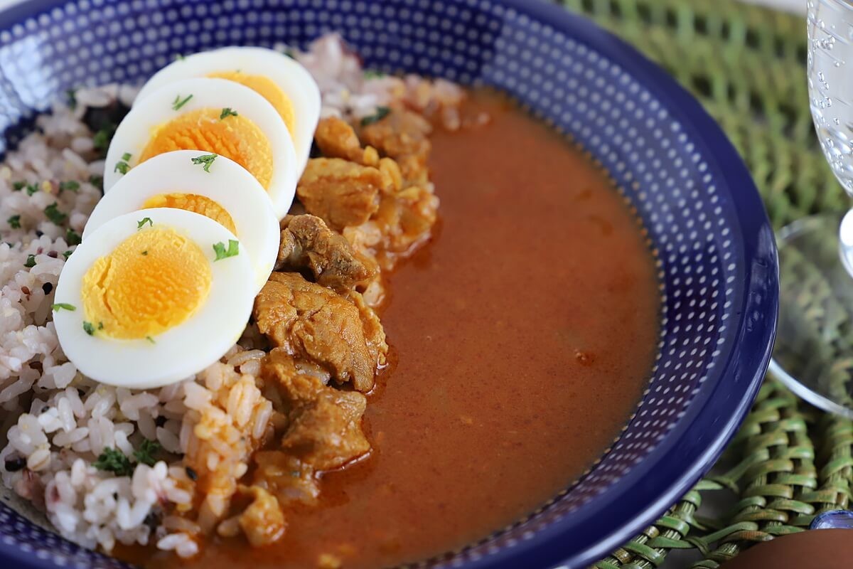 - 少し深さのある器にご飯を入れ、カレーが流れないように高さのあるダム風の形を作る。