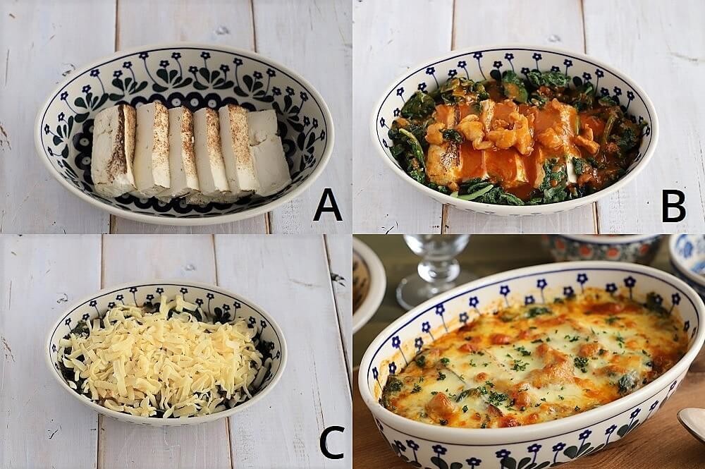 冷凍ほうれん草を豆腐の周りに適量入れ、バターチキンカレーを全量入れる(写真B)。