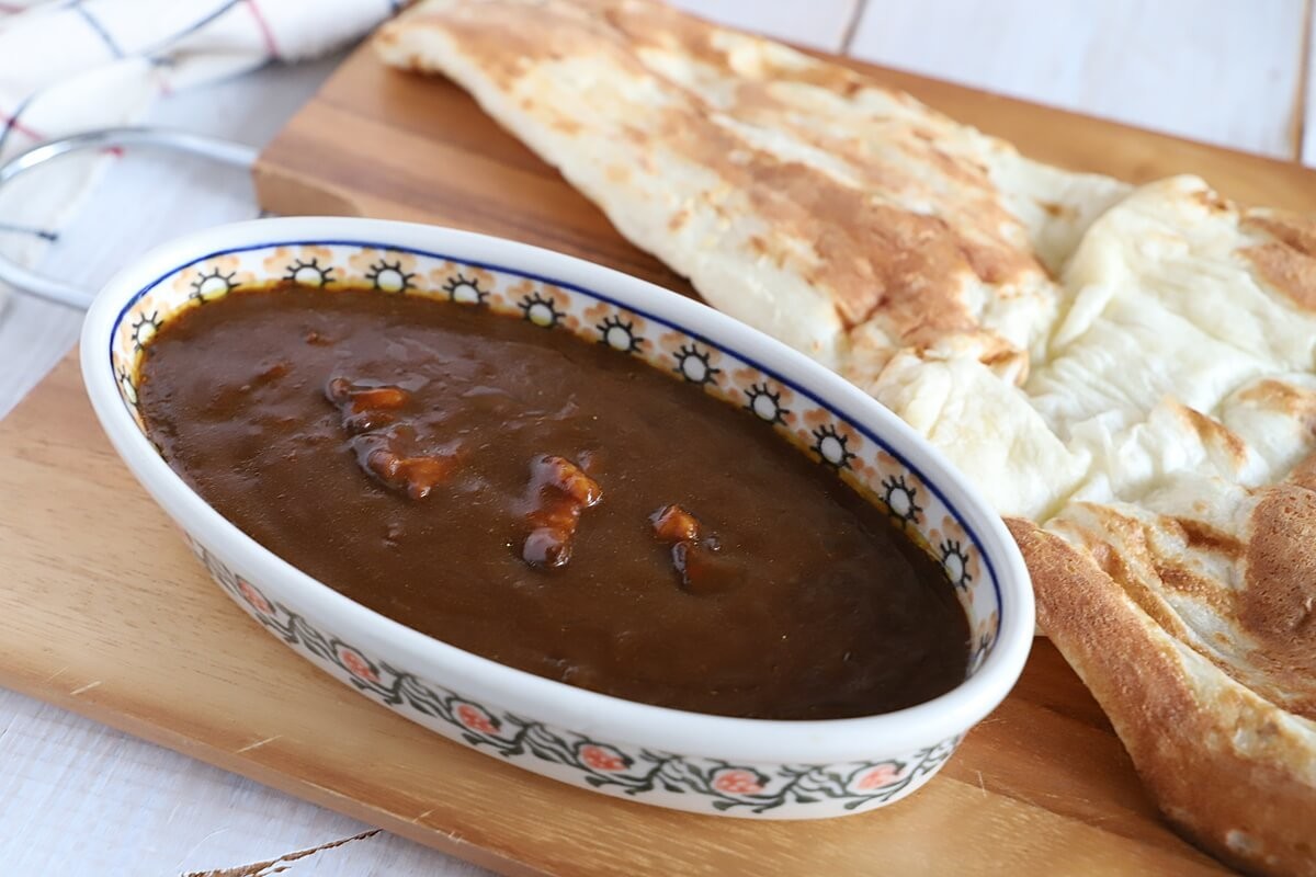湯せんして、ナンと合わせていただいてみました。「お肉がごろっと」というネーミングからはもう少し大きめのビーフを想像していましたが、柔らかくて崩れてしまったのでしょうか、小さいサイズのものがいくつか入っていました。