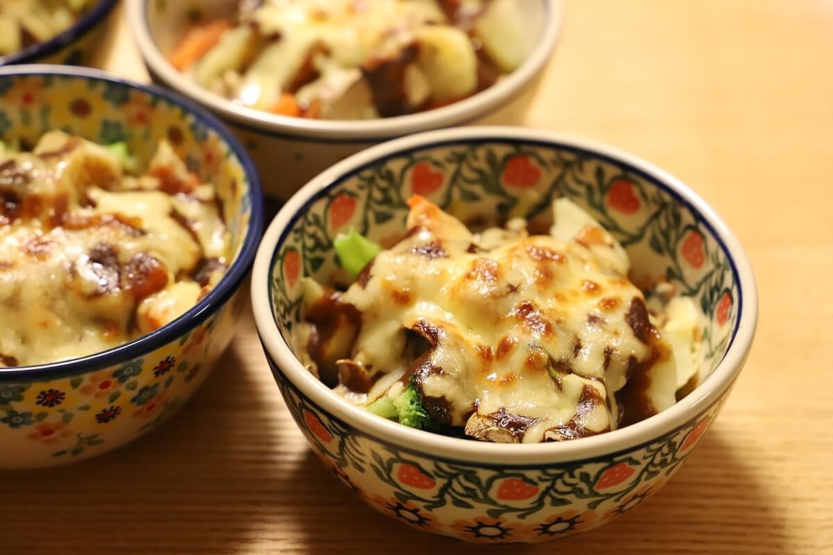 野菜には軽く塩、こしょうをし、ビーフカレーを均等にかけ、とろけるチーズをのせ、オーブントースターで加熱すれば出来上がり!