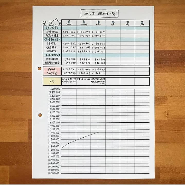 総貯金額も、数字だけでなくグラフにしています。右肩上がりになることでモチベーションもUP!有名なファイナンシャルプランナーの先生も「貯金簿」というものをすすめています。私も、自然と、ムダづかいが減らせたので、思いのほか節約効果が大きいと思います。